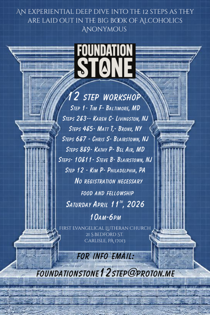 12 Step Workshop 10:00 am – 6:00 pmApril 11, 2026 First Evangelical Lutheran Church21 S. Bedford St.Carlisle, PA 17013View LocationMap First Evangelical Lutheran Church View full calendar