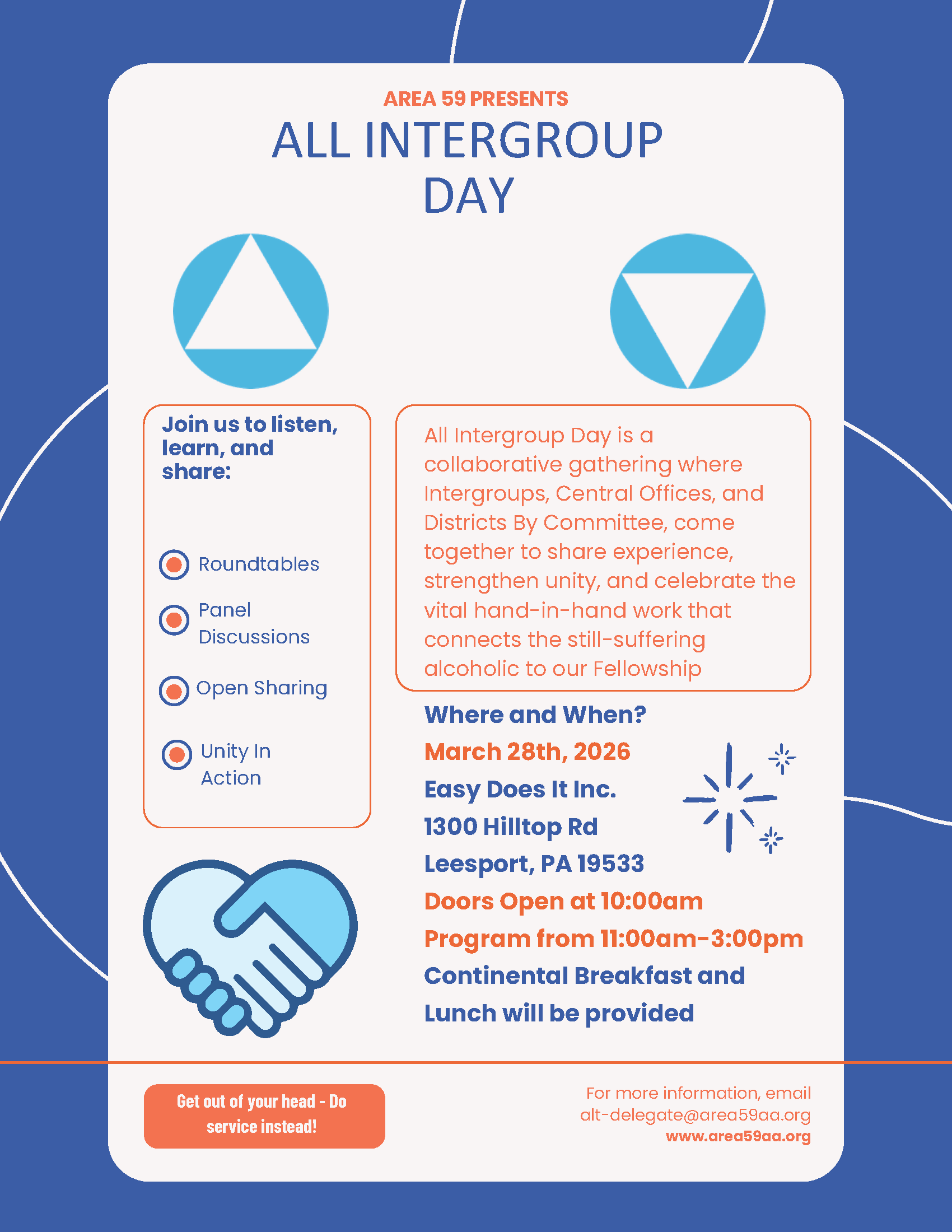 Area 59 Presents: All Intergroup Day! 10:00 am – 3:00 pmMarch 28, 2026 Easy Does It Inc1300 Hilltop RdLeesport, PA 19533View LocationMap Easy Does It Inc View full calendar