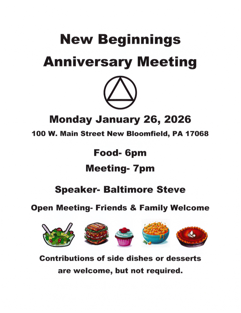 New Beginnings - New Bloomfield Anniversary Meeting 6:00 pm – 8:00 pmJanuary 26, 2026 New Bloomfield Methodist Church100 W Main StNew Bloomfield, PA 17068View LocationMap New Bloomfield Methodist Church View full calendar