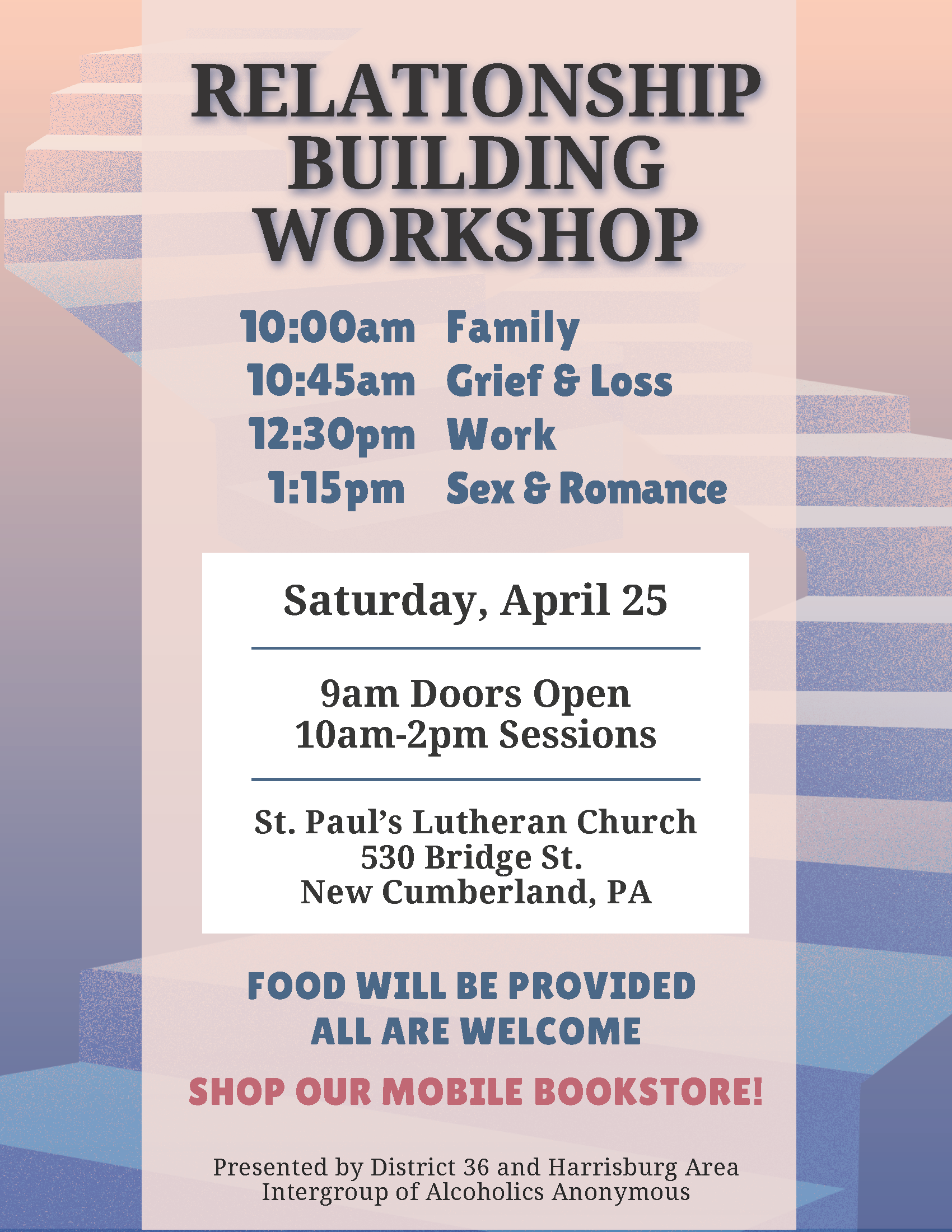 Relationship Building Workshop 10:00 am – 11:00 amApril 25, 2026 St. Paul Lutheran Church530 Bridge St.New Cumberland, PA 17070View LocationMap St. Paul Lutheran Church View full calendar