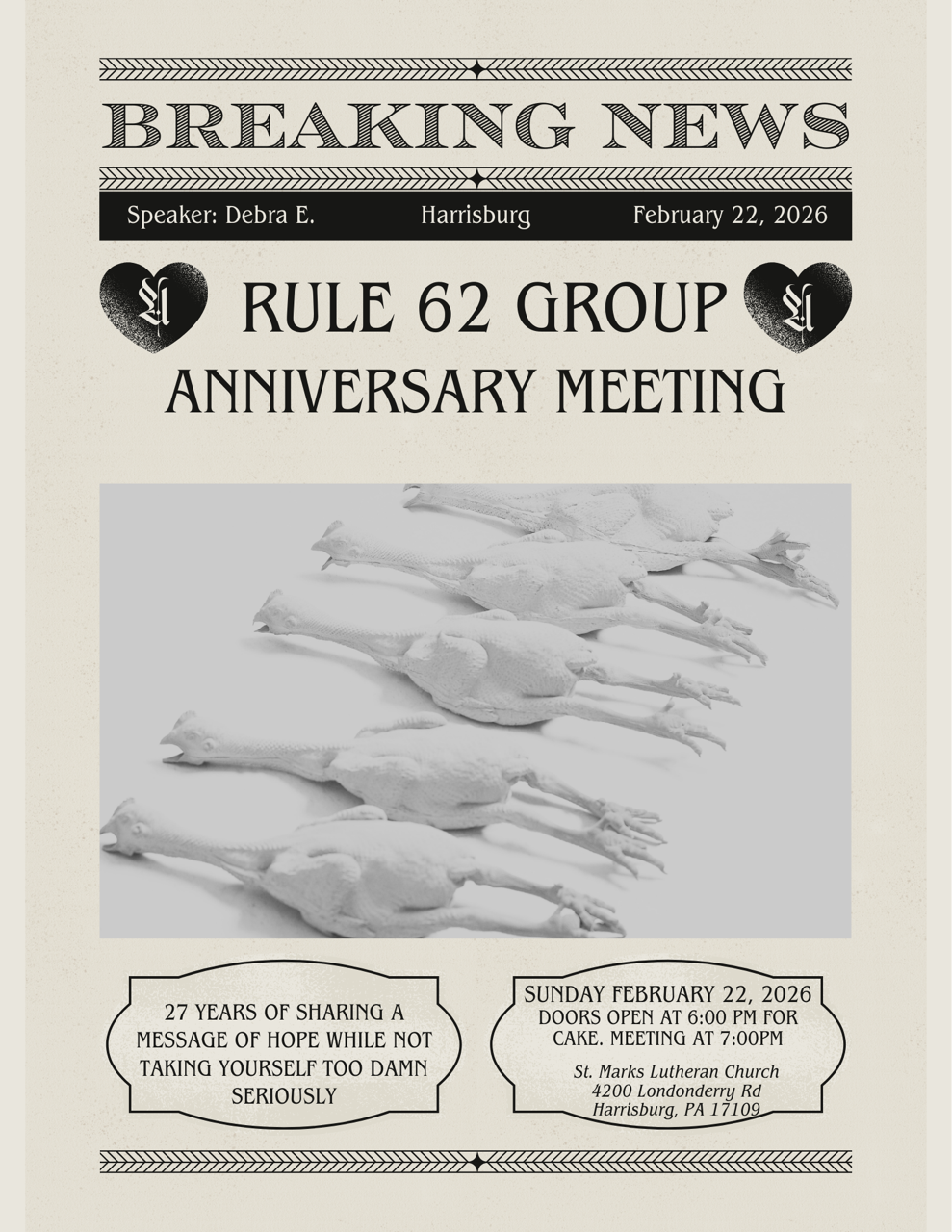 Rule 62 Group Anniversary 6:00 pm – 8:00 pmFebruary 22, 2026 St. Mark's Lutheran Church4200 Londonderry RoadHarrisburg, PA 17109View LocationMap St. Mark's Lutheran Church View full calendar