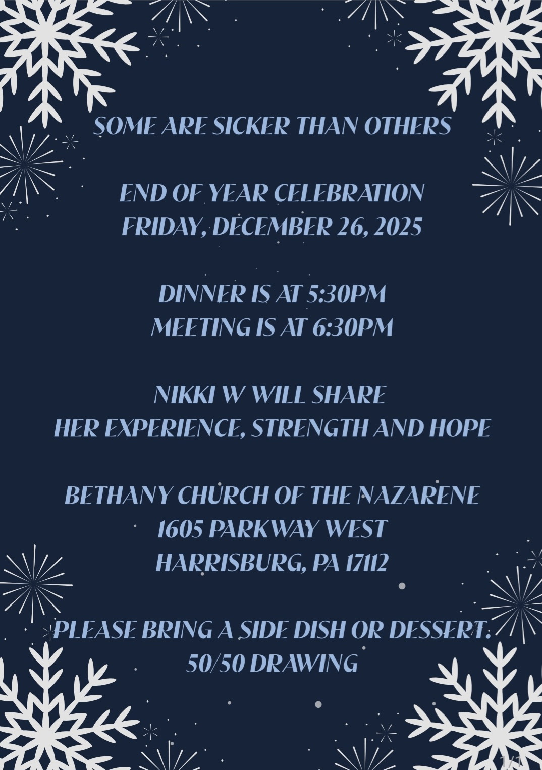 Some Are Sicker Than Others Holiday Event 5:30 pm – 7:30 pmDecember 26, 2025 Bethany Church of the Nazarene1605 Parkway WestHarrisburg, PA 17112View LocationMap Bethany Church of the Nazarene View full calendar