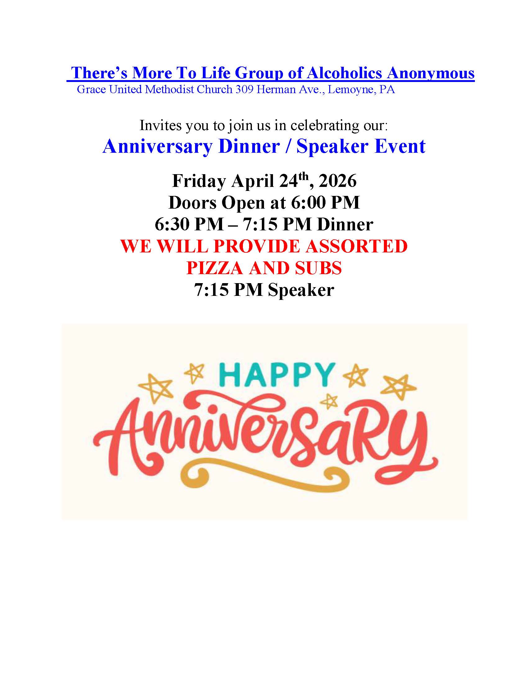 There's More To Life Group 37th Anniversary Dinner + Speaker Event April 24, 2026 Grace United Methodist Church309 Herman AveLemoyne, PA 17043View LocationMap Grace United Methodist Church View full calendar