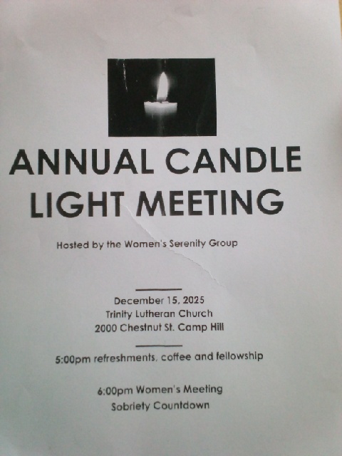 Women's Serenity Group Candle Light Meeting 5:00 pm – 7:00 pmDecember 15, 2025 Trinity Lutheran ChurchView Location View full calendar